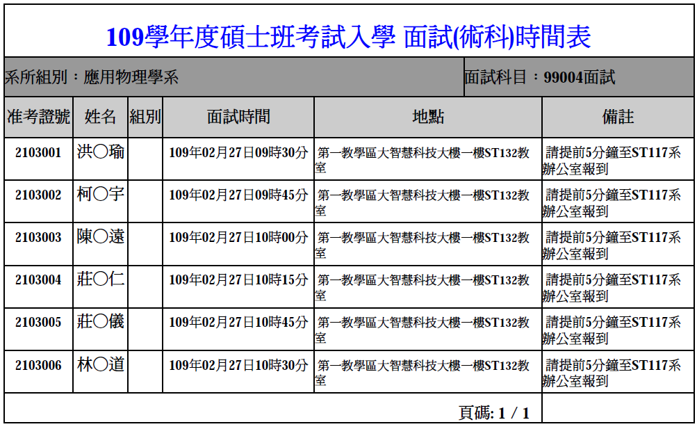 109學年度碩士班招生入學考試: 應用物理學系[面試]時間表