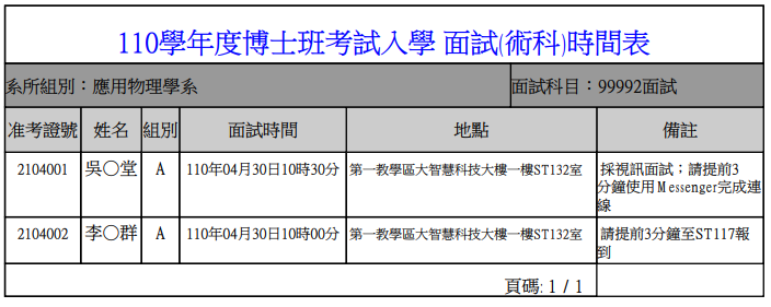 請面試考生依招生簡章規定,準備15分鐘口頭報告(含:自我介紹、研究成果及研究構想等),可使用簡報檔。