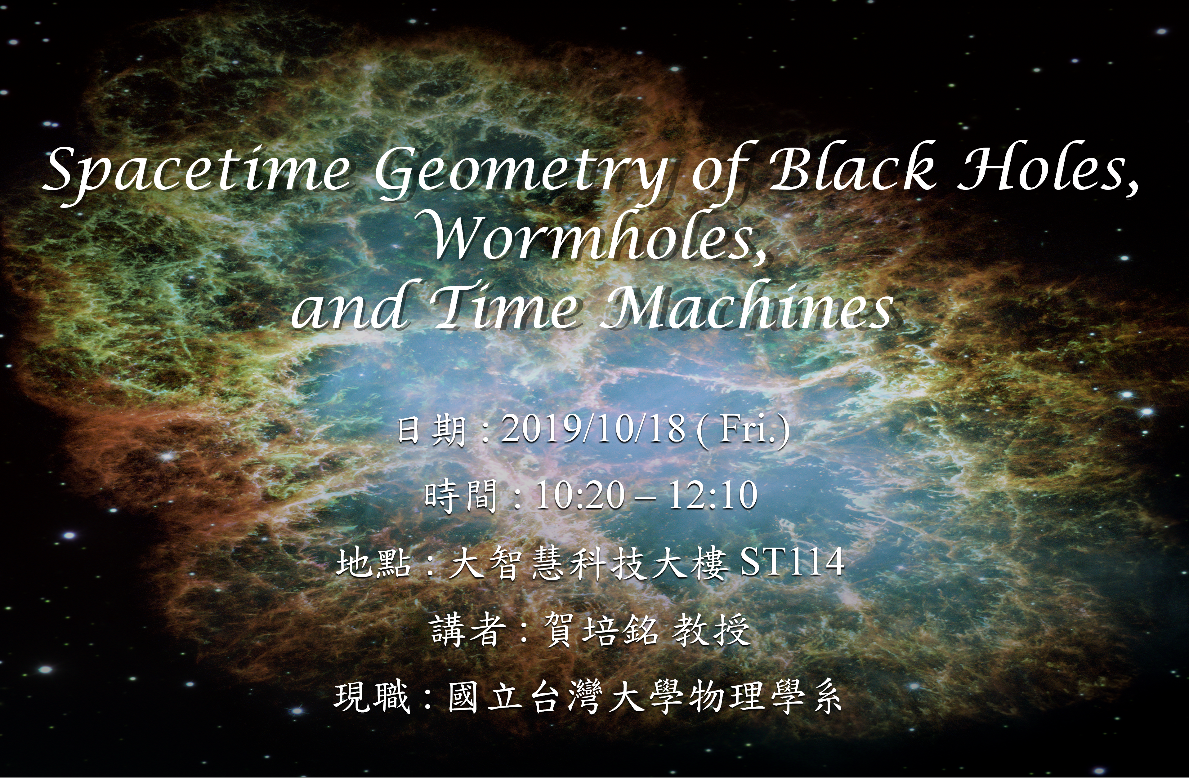 10/18專題演講 : 國立台灣大學物理學系 賀培銘教授 [Spacetime Geometry of Black Holes, Wormholes, and Time Machines]