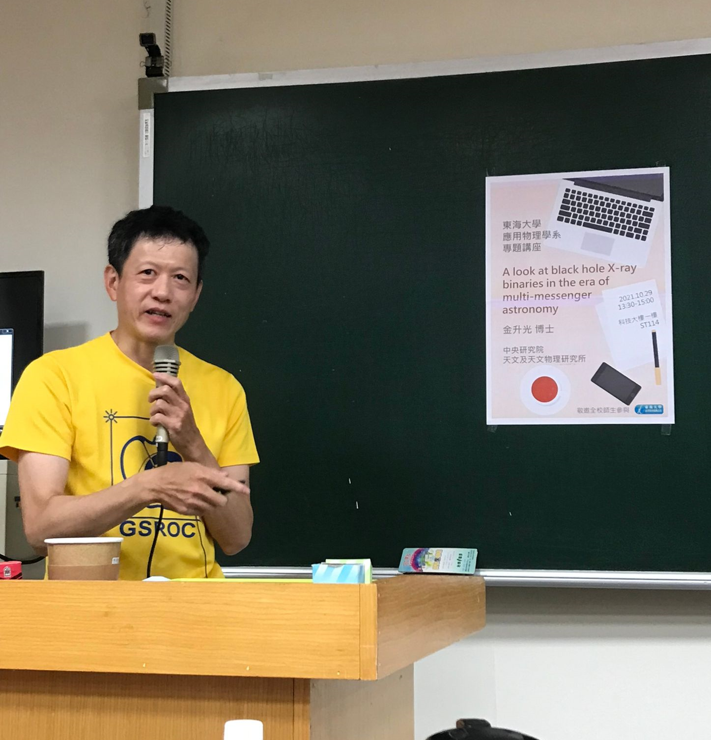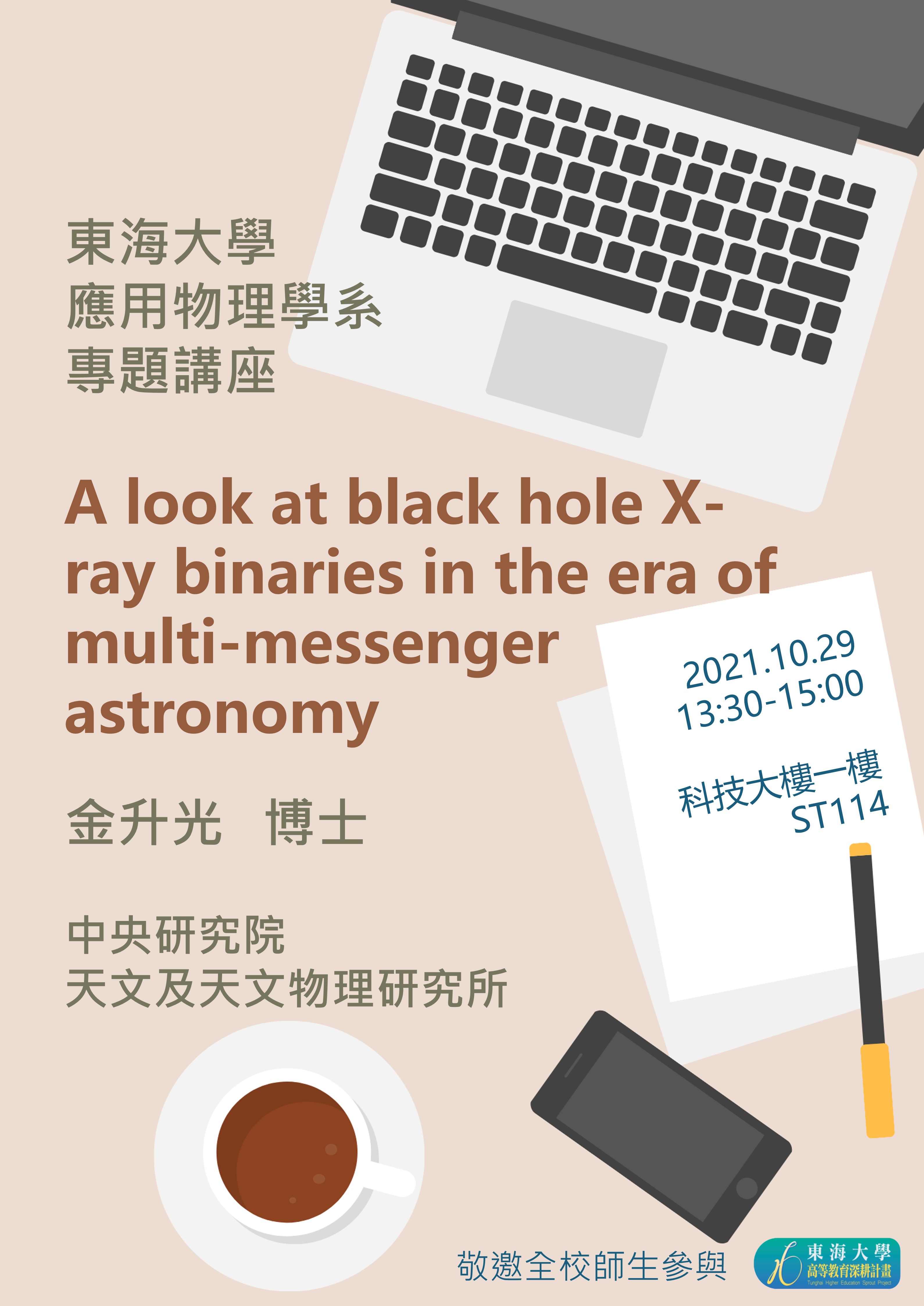2021/10/29本系邀請到中央研究院天文及天文物理研究所主題計畫科學家金升光博士前來進行學術演講,講題為”A look at black hole X-ray binaries in the era of multi-messenger astronomy”。金博士以天文學家對黑洞的探索為基礎,介紹了各種量測工具,包括電波、可見光、X-光、咖瑪射線以及重力波在天文探測中所扮演的角色,另外也介紹了天文物理學家如何利用基礎物理理論及天文觀測的結果來探索黑洞的奧秘。