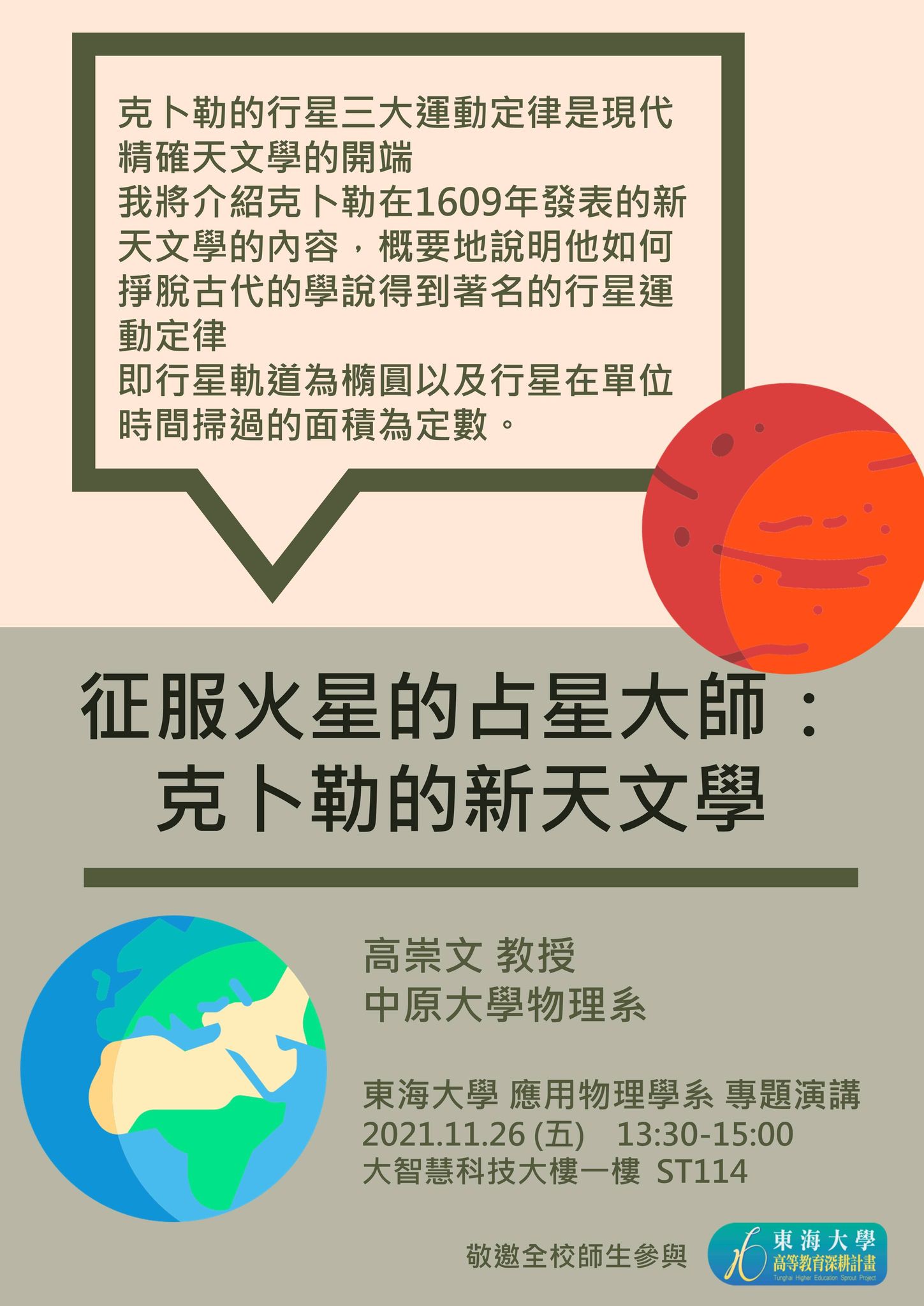 11/26 專題演講: 中原大學物理學系 高崇文教授 [征服火星的占星大師:克卜勒的新天文學]