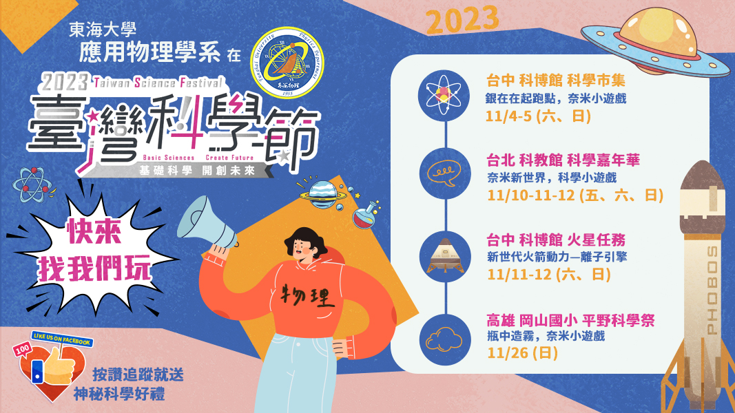 2023台灣科學節於上周開始展開活動,東海大學應用物理學系,在台灣北中南一共四場科普實驗攤位,現場除了會分享有趣科普小實驗之外,還有精彩的科學小禮物準備要送給你們哦。快來找我們吧~