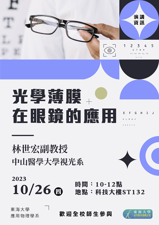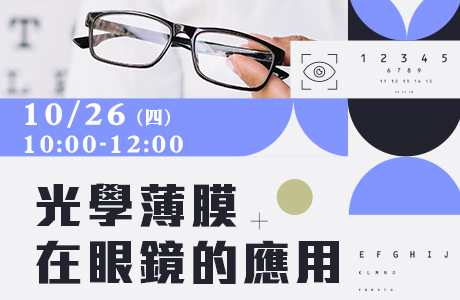 講題:光學薄膜在眼鏡的應用 時間:112/10/26 週四 上午10:00至12:00 地點:大智慧科技大樓 ST132教室
