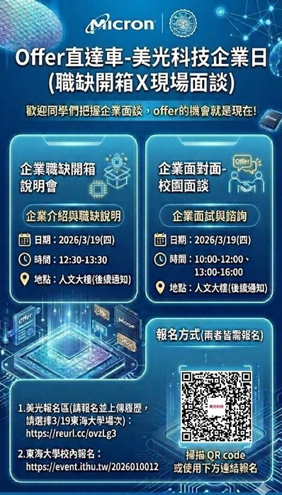 美光報名區(請同步於企業網頁報名並上傳履歷,請選擇3/19東海大學場次):https://micron.az1.qualtrics.com/jfe/form/SV_9KWYO0VgBHqyKea