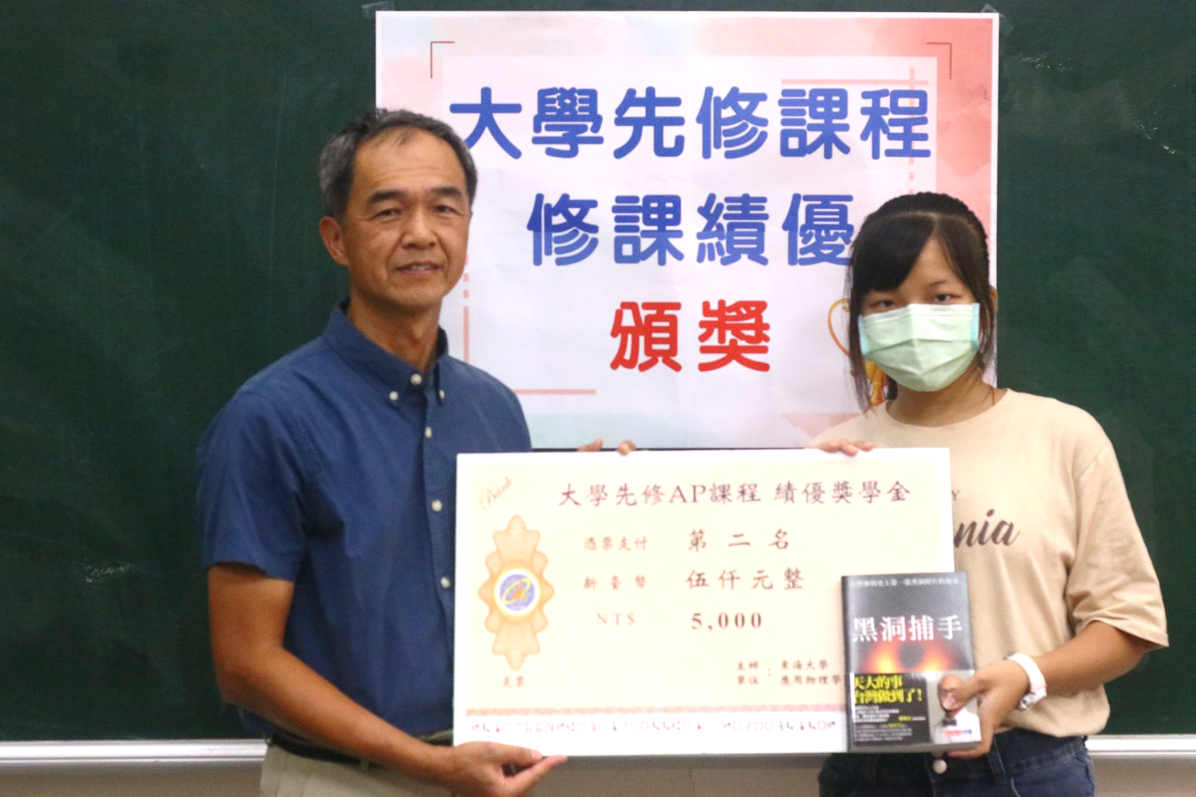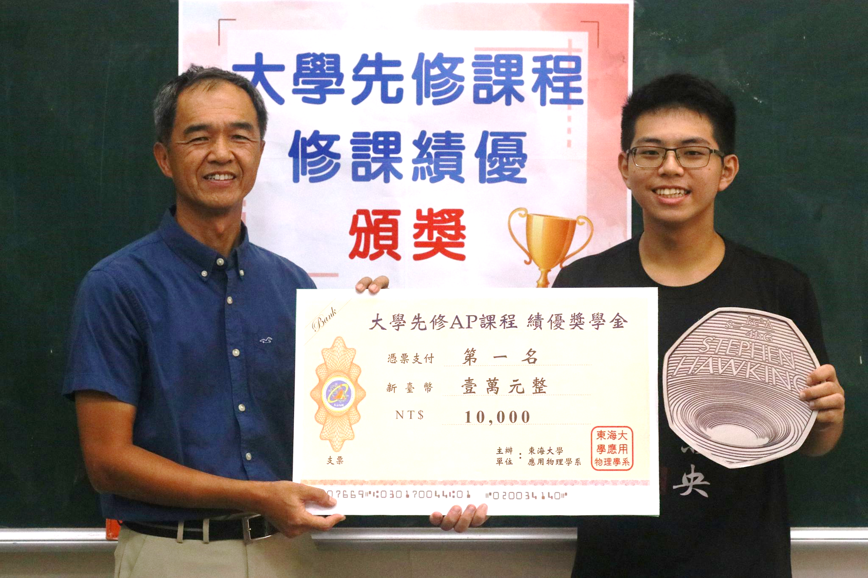 今天發給10位同學獎學金,第一名有一萬元、還可以獲得最令人期待的英國皇家鑄幣局發行的霍金、黑洞紀念幣!第二名有獎金五仟元,第三名獎金三仟元,第四到十名一仟元!
