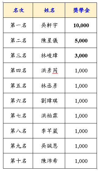 第四名到第十名 獎學金一仟元