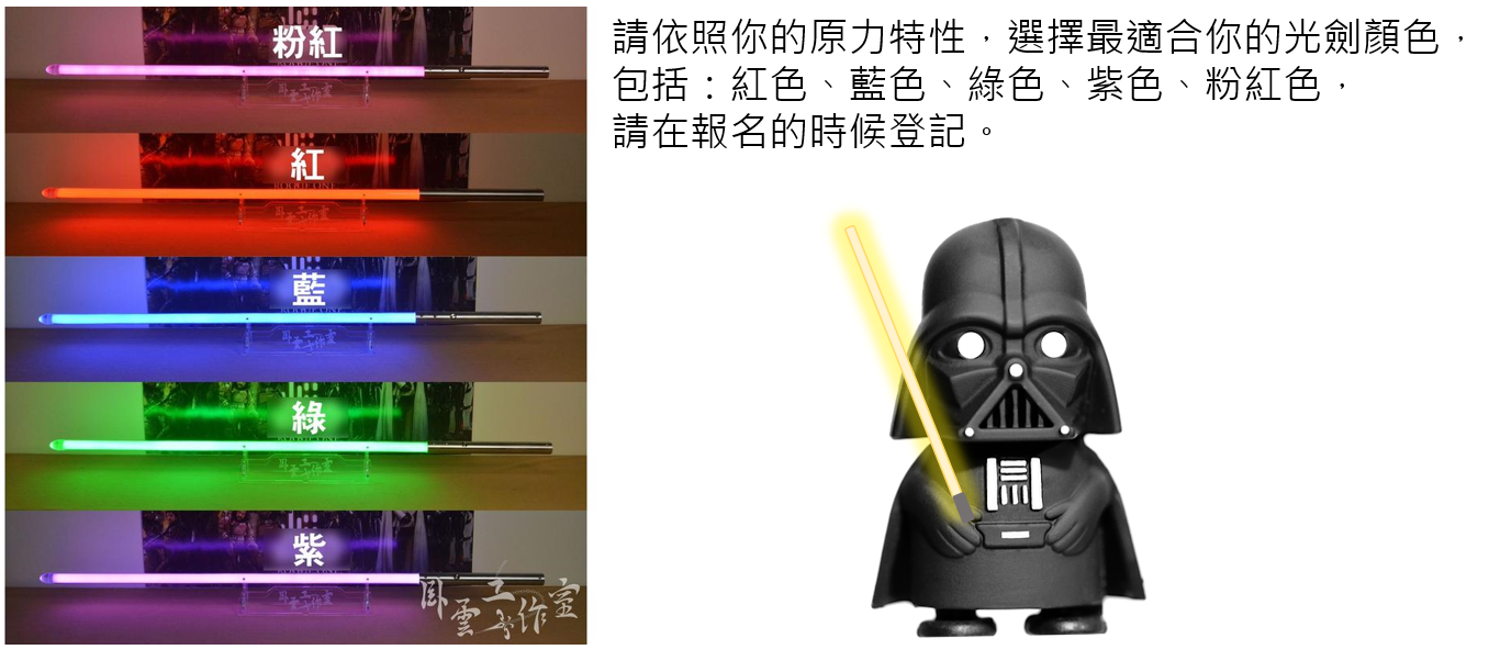例1 : 報名者如選購 基礎款光劍 + 素面劍柄,費用即為 1500元 (此費用皆已內含報名者的保險及午餐)