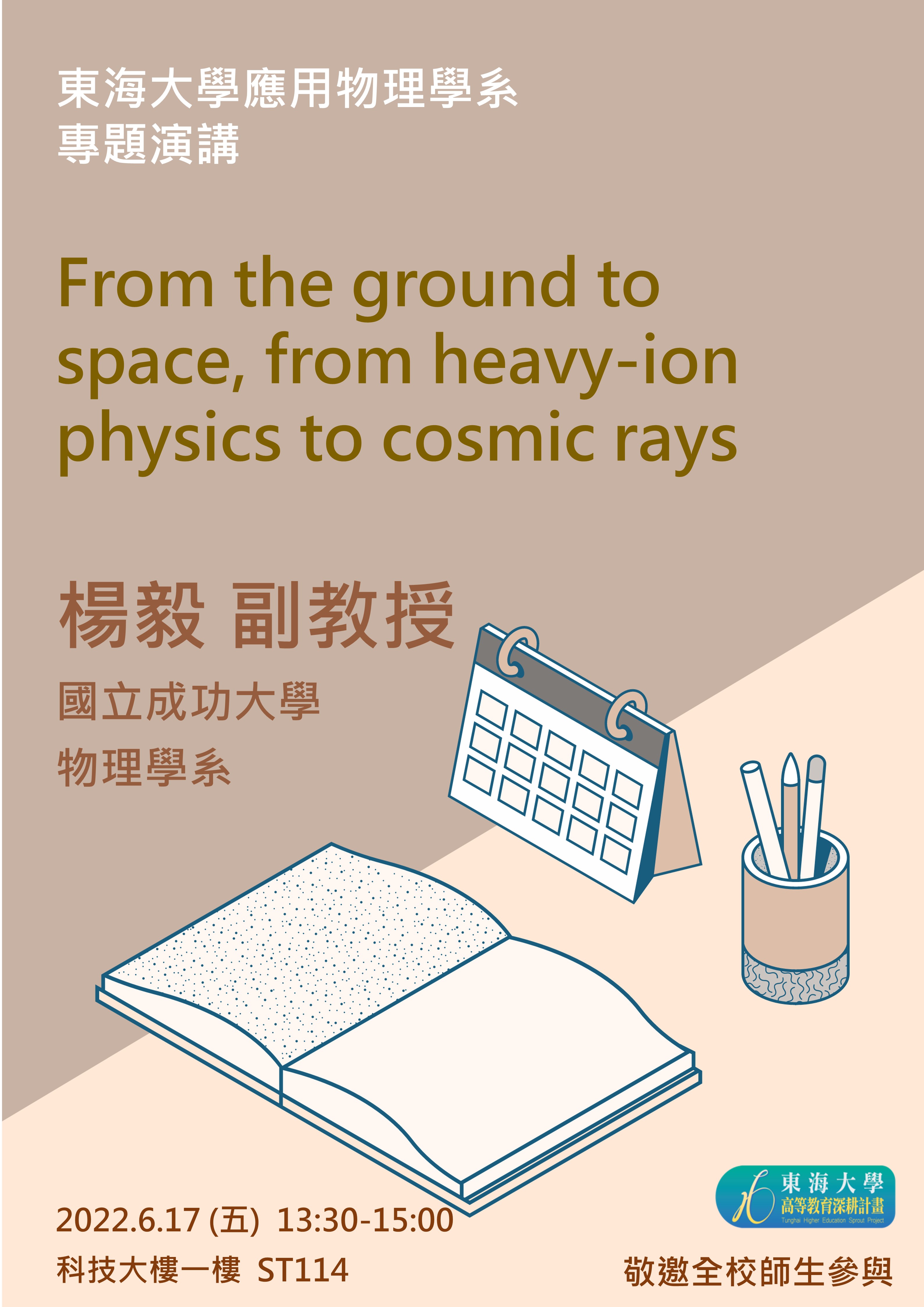 6/17 專題演講:國立成功大學物理學系 楊毅副教授 [From the ground to space, from heavy-ion physics to cosmic rays]