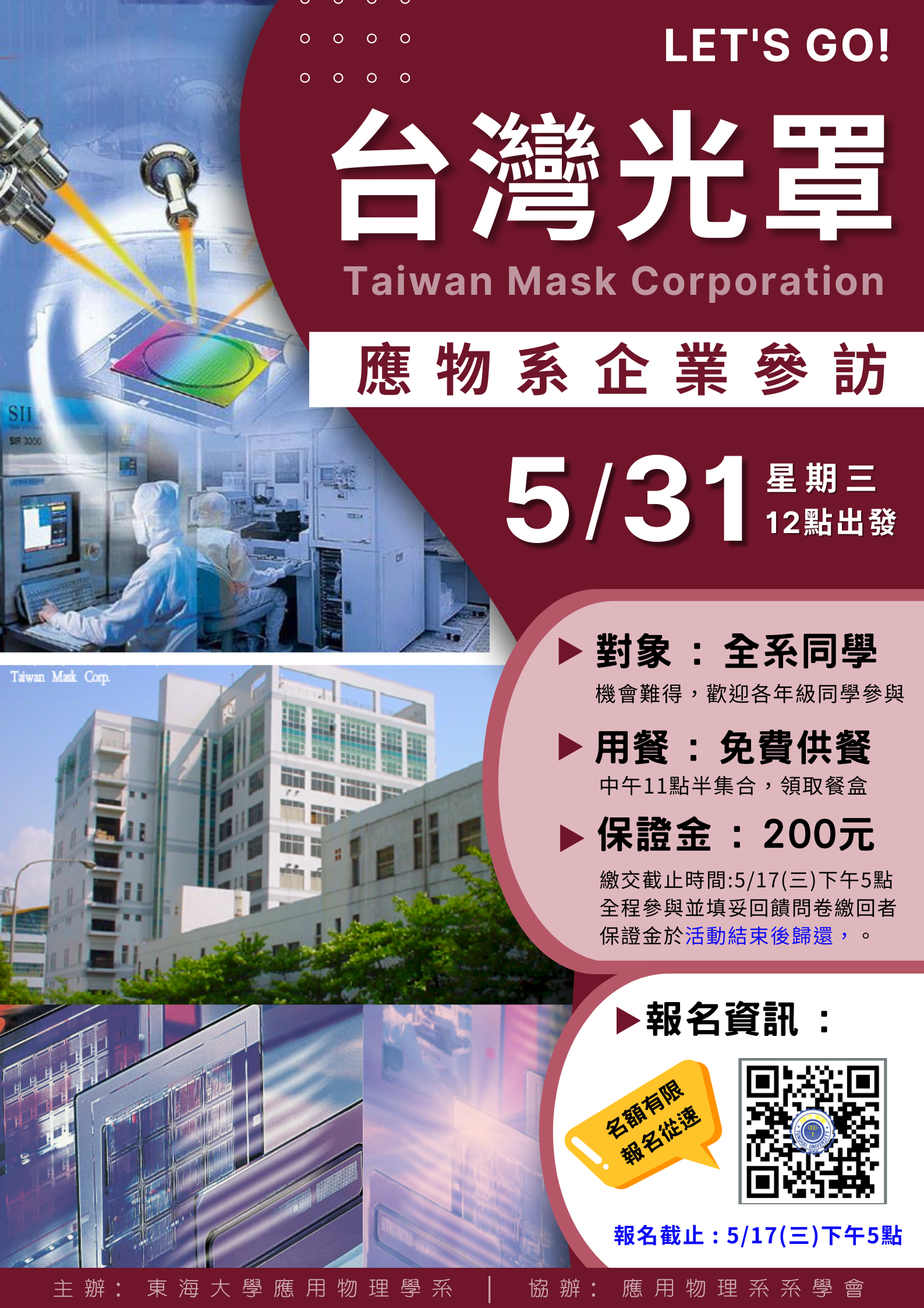 參訪企業為台灣光罩(股)公司,這是國內成立最早、規模最大的專業光罩廠,同時也是亞太地區最重要的光罩製造廠之一。請同學們把握機會、踴躍報名參加!