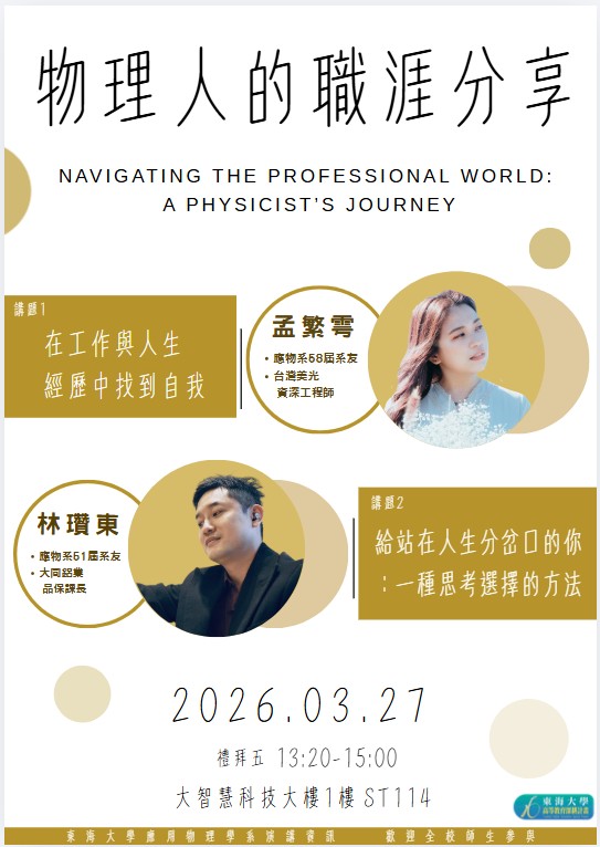 本次演講邀請到深耕不同領域的優秀系友,分享從物理學子轉化為職場菁英的實踐心法。 孟繁雩系友目前任職於台灣美光,將以資深工程師的視角,探討如何在繁重的工作與多元的人生經歷中抽絲剝繭,精確定位自我價值與職涯發展。林贊東系友則擔任大同鋁業品保課長,他將物理學嚴謹的「方程式」思維導入跨領域決策,指導學弟妹在面臨人生分岔路口時,如何建立一套理性的思考邏輯與選擇方法。